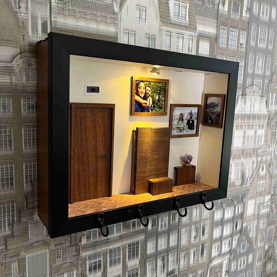 It consists of 4 personalized photos and measures 22 cm in width, 29 cm in height, and 5 cm in depth. It operates with 2 AA batteries.